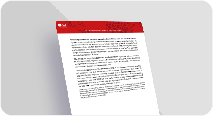 C The Cash Learning Partnership THE STATE OF THE WORLD’S CASH REPORT – ANNEX: CASE STUDIES Overcoming constraints and perceptions of risk within donors: Whilst DFID and ECHO’s initiative in Lebanon highlighted interest from other (European) donors about more joined-up approaches, part of the reticence of UN agencies to move forward was as result of concerns that other major donors (potentially including the United States) would not follow suit. There could have been more consultation with donors (including at headquarters level) to discuss the possible options, evidence and constraints that agencies might face. There is a need for dialogue on cash between all major donors to explore concerns, perceived risks and real constraints to more harmonized approaches to CTP at scale. What it means for progress towards the Grand Bargain commitments: Experiences in Lebanon demonstrate the difficulties in making progress on some of the global commitments relating to CTP, because of the different ways that these can be interpreted and because of concerns – whether perceived or real – that changes to the established ways of working will create winners and losers. Current situation: As of the end of 2017, WFP is implementing a multi-donor programme to provide unrestricted cash assistance to cover food and non-food essentials to the most vulnerable Syrian refugee families. The programme includes independent monitoring, evaluation, accountability and learning (MEAL), focused on outcomes and Value for Money (VfM) analysis, and a multi-stakeholder governance structure. All of the existing harmonized processes under LOUISE such as the One Card and joint targeting are being used. Beneficiaries will receive a single, unrestricted cash transfer, rather than separate vouchers and cash, and this is being provided by one rather than the previous two agencies, streamlining the system. Sources: Cabot Venton et al. (2015) Value for Money of Cash Transfers in Emergencies, a report for DFID; Bailey and Harvey (2017) The DFID/ECHO Approach to Cash Assistance For Refugees in Lebanon: Documenting the Process, ODI; Boston Consulting Group (2017) Food – Restricted Voucher or Unrestricted Cash: How to best support Syrian refugees in Jordan and Lebanon, World Food Programme and Boston Consulting Group; Creti (2015) Evaluation of the One Card Pilot in Lebanon, UNHCR; Sykes (2017) Lebanon Cash Consortium Review, a report for the LCC; interviews with DFID UK, DFID Lebanon, SCI Lebanon, Solidarites and UNICEF. 28