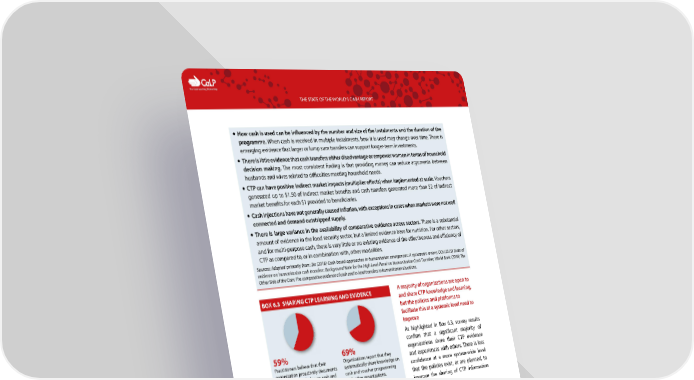 C The Cash Learning Partnership THE STATE OF THE WORLD’S CASH REPORT — How cash is used can be influenced by the number and size of the instalments and the duration of the programme. When cash is received in multiple instalments, how it is used may change over time. There is emerging evidence that larger or lump sum transfers can support longer-term investments. — There is little evidence that cash transfers either disadvantage or empower women in terms of household decision making. The most consistent finding is that providing money can reduce arguments between husbands and wives related to difficulties meeting household needs. — CTP can have positive indirect market impacts (multiplier effects) when implemented at scale. Vouchers generated up to $1.50 of indirect market benefits and cash transfers generated more than $2 of indirect market benefits for each $1 provided to beneficiaries. — Cash injections have not generally caused inflation, with exceptions in cases when markets were not well connected and demand outstripped supply. — There is large variance in the availability of comparative evidence across sectors. There is a substantial amount of evidence in the food security sector, but a limited evidence base for nutrition. For other sectors, and for multi-purpose cash, there is very little or no existing evidence of the effectiveness and efficiency of CTP as compared to, or in combination with, other modalities. Sources: Adapted primarily from: 3ie (2016) Cash-based approaches in humanitarian emergencies: A systematic review; ODI (2015) State of evidence on humanitarian cash transfers: Background Note for the High Level Panel on Humanitarian Cash Transfers; World Bank (2016) The Other Side of the Coin: The comparative evidence of cash and in-kind transfers in humanitarian situations. BOX 6.3 SHARING CTP LEARNING AND EVIDENCE A majority of organizations are open to and share CTP knowledge and learning, but the policies and platforms to facilitate this at a systemic level need to improve As highlighted in Box 6.3, survey results 59% 69% confirm that a significant majority of organizations share their CTP evidence Practitioners believe that their Organizations report that they and experiences with others. There is less organization proactively documents systematically share knowledge on confidence at a more system-wide level and shares knowledge on cash and cash and voucher programming voucher programming with others. with other organizations. that the policies exist, or are planned, to 1/2 improve the sharing of CTP information and evidence. Practitioners believe that the policies that exist (or are under development) will be effective in improving the sharing of information, learning and The practitioner survey asks about the evidence related to CTP. main barriers to the systematic sharing of information, evidence and learning on CTP. The most significant barrier, cited by 40% of respondents, is a lack of awareness of common platforms for information sharing. At the same time, 31% cite a lack of common platforms as a main barrier, and 29% a resistance to using common platforms. Organizational interviews revealed similar findings, while CaLP’s knowledge and evidence scoping study found that different types of audience (e.g., practitioners, donors, etc.) have differing key needs in terms of CTP materials and evidence. These results indicate that there are a variety of issues to be addressed before progress can be made, including raising awareness of existing platforms, and ensuring these are fit for purpose. Furthermore, it is imperative that dissemination is translated into actual uptake and use, critically, in project “The evidence base is almost all very positive. design and decision making, which has implications for how We need to have more about the challenges. common platforms engage users. The WHS self-reporting 90% of the evidence is positive, but that might analysis included a recommendation for more support to be be because the negatives are not shared. provided to communities of practice to foster partnership Donors need to encourage and support the and support learning, knowledge sharing, networking and sharing of failure and learning to improve coordination. CaLP’s planned Knowledge Hub (see Box 6.4) is humanitarian action.” NRC being developed with the aim of addressing key issues with sharing CTP evidence and learning. 81