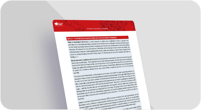 C The Cash Learning Partnership THE STATE OF THE WORLD’S CASH REPORT BOX 6.11 PILOTING BLOCKCHAIN TECHNOLOGY FOR CASH-BASED TRANSFERS What is Blockchain?: Blockchain is a data structure in which every modification of data is agreed to by participants on a network, providing a complete record of all the data modifications that have ever taken place in that chain. Encoding is used to prevent tampering, and that no new modifications can be made without detection. Participants can trust data held on a blockchain without having to know or trust one another and without having to rely on a central authority like a bank, credit card company or government. (Adapted from Center for Global Development (2017) Policy Paper 107: Blockchain and Economic Development: Hype vs. Reality, p. 1.) Blockchain and humanitarian aid: Blockchain has the potential to speed up the distribution of aid funding and trace every pound spent – from original donor to each individual assisted. This also removes intermediaries, lowering the chance of fraud and the cost of transactions. For example, WFP expects that using a blockchain ledger can reduce their overhead costs from 3.5% to around 1% (see below). Blockchain also has the potential to speed aid to remote or disaster-struck areas, where ATMs or banks do not exist or are not functioning normally. The largest pilot of blockchain in humanitarian aid has been that of WFP in Jordan, providing assistance to refugees in Azraq camp in Jordan using Ethereum-based blockchain ledger technology. Ultimately, they plan to scale up to cover their entire caseload of 500,000 people. Beneficiaries can purchase food using iris scans; this is essentially a voucher-based intervention in that purchases are restricted to participating supermarkets, with no cash withdrawal option. WFP runs the blockchain itself – there are no other entities involved at this stage – with the fact that they are now operating their own payment network, rather than needing to go through other service providers, accounting for the cost savings. The programme’s costs are front loaded, with heavy fixed costs (IT, staff, cost of beneficiary registration, etc.), and the payback period is expected to be one to two years. This is driven by lower overall delivery costs, which were 1–3% lower as a result of a reduction in bank fees. Another example is the partnership between START network (an alliance of 42 aid organizations), and the Blockchain startup Disberse to speed up fund distribution, reduce transfer costs and ensure accountability. Having completed an initial pilot, which resulted in zero leakage and reduced costs, Disberse intends to work with a START member to directly transfer funding from the UK to a crisis-hit country, and subsequently, to use the platform for direct transfers from multiple organizations, demonstrating scalability of the model. World Vision International too, has helped develop a blockchain ledger-based digital asset transfer platform in Nepal called Sikka (www.sikka.me). Sikka allows transfer of digital tokens directly to a beneficiary’s phone (including simple feature phones), which can be exchanged at local cooperatives. Despite the promise of the technology, it’s application is still very restricted. There are several interesting areas, including integration with digital money platforms, and digital identity management. A fintech start- up BanQu (www.banquapp.com/about) has demonstrated the use of blockchain in digital identity creation and management. It allows the unbanked to set up a personal identification profile while connecting to their banked network. Bitcoin ledger allows them to accumulate a transaction history and develop a traceable, vetted financial and personal history. Blockchain offers economies of scale, which can be leveraged by interoperability of data and sharing of common platforms. Some players like WFP have open sourced their platform with no licensing fee, which can be used by other organizations instead of duplicating and fragmenting the blockchain. Hence, there is a case for organizations to collaborate to take the technology forward and optimize the benefits of the technology. Sources: Interviews with WFP and Disberse; CaLP D-Group discussions; Center for Global Development (2017) Policy Paper 107: Blockchain and Economic Development: Hype vs. Reality; https://davidgerard.co.uk/blockchain/2017/11/26/the-world-food-programmes-much-publicised- blockchain-has-one-participant-i-e-its-a-database/ 91