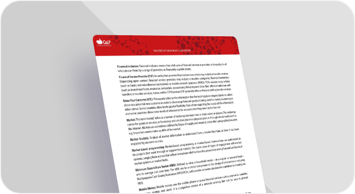 C The Cash Learning Partnership THE STATE OF THE WORLD’S CASH REPORT Financial Inclusion: Financial inclusion means that a full suite of financial services is provided, with quality, to all who can use them, by a range of providers, to financially capable clients. Financial Service Provider (FSP): An entity that provides financial services, which may include e-transfer services. Depending upon context, financial service providers may include e-voucher companies, financial institutions (such as banks and microfinance institutions) or mobile network operators (MNOs). FSPs include many entities (such as investment funds, insurance companies, accountancy firms) beyond those that offer humanitarian cash transfers or voucher services, hence, within CTP literature, FSP generally refers to those providing transfer services. Know Your Customer (KYC): This usually refers to the information that the local regulator requires banks to collect about any potential new customer in order to discourage financial products being used for money laundering or other crimes. Some countries allow banks greater flexibility than others regarding the source of this information, and some countries allow lower levels of information for accounts that they deem to be ‘low risk’. Market: The term ‘market’ refers to a system of exchange between two or more actors or players. The exchange can be for goods or services, or for money, and can take place in a physical space or through virtual media such as the internet. Markets are sometimes defined by forces of supply and demand, rather than geographical location e.g. ‘imported cereals make up 40% of the market’. Market Analysis: Analysis of market information to understand how a market functions, or how it has been impacted by an event or crisis. Market-based programming: Market-based programming or market-based interventions are understood to be projects that work through or support local markets. The terms cover all types of engagement with market systems, ranging from actions that deliver immediate relief to those that proactively strengthen and catalyse local market systems or market hubs. Minimum Expenditure Basket (MEB): Defined as what a household needs – on a regular or seasonal basis – and its average cost over time. The MEB can be a critical component in the design of interventions including Multipurpose Cash Grants/Assistance (MPG/MCA), with transfer amounts calculated to contribute to meeting the MEB. Mobile Money: Mobile money uses the mobile phone to access financial services such as payments, transfers, insurance, savings and credit. It is a paperless version of a national currency that can be used to provide humanitarian e-cash payments. Modality: See Assistance Modality and Cash Modality. Multiplier Effect: Indirect effects of cash transfers whereby increased expenditure by recipients contributes to income growth for non-recipients, expansion of markets for local goods or increased demands for services. The ‘economic multiplier’ is the estimated number by which a change in some other component of aggregate demand is multiplied to give the total amount by which the national income is increased as a result of direct and indirect benefits from that change in demand. Multipurpose Cash Grant (MPG)/ Multipurpose Cash Assistance (MCA): MPGs or MCAs are defined as a transfer (either regular or one-off) corresponding to the amount of money a household needs to cover, fully or partially, a set of basic and/or recovery needs. They are, by definition, unrestricted cash transfers. The MPG/MCA can contribute to meeting a Minimum Expenditure Basket (MEB) or other calculation of the amount required to cover basic needs, but can also include other one-off or recovery needs. Private Sector: The private sector includes any actors which generate surplus income/profit through their business operations. This includes small individual traders and micro-enterprises, small firms employing temporary labour, cooperatives with numerous ‘members’ or shareholders, through to multinational companies. The absolute criteria for what is/isn’t the private sector is blurred, as many private firms are owned by governments, and some enterprises – for instance, ‘social enterprises’ – have business plans that generate a profit which is invested back in to society. 17
