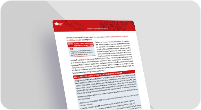C The Cash Learning Partnership THE STATE OF THE WORLD’S CASH REPORT Agencies have recognized the need to build the evidence base on achieving sectoral outcomes through CTP in multiple sectors, and are acting on this BOX 6.5 PERSPECTIVES ON EVIDENCE Research for this report (surveys, interviews and FGDs) revealed FOR USE OF CTP IN SECTORS that, overall, respondents note a lack of sufficient evidence for 1/2 the appropriate use of cash and vouchers in some sectors. Practitioners agree that sufficient evidence is Similarly, existing systematic studies and syntheses, as well as 128 available about how to use cash and vouchers sector-wide reviews, point to very limited evidence in some appropriately in different sectors. sectors, including health, nutrition, WaSH, shelter and protection. There is a need to build credible evidence about sector outcomes. This is both in terms of the effectiveness of different types of CTP, and more broadly regarding the use of a range of aid modalities. Various sectors are beginning to gather and review existing evidence, and develop research agendas, probably stimulated in part by policy developments. The work of the Global Health Cluster is a good example of progress (see Box 6.6). Other global clusters, e.g., WaSH and education, are also studying this issue, and there are multiple examples of collective and agency-level initiatives to identify sectoral evidence gaps, and begin to address them through research and learning.129 BOX 6.6 RESEARCH AGENDA-SETTING ON CTP FOR HEALTH AND NUTRITION Recognizing the limited evidence base for CTP for health and nutrition in humanitarian assistance, the World Health Organization (WHO) and the Global Health Cluster commissioned a study to identify research priorities. A total of 189 suggested research questions were collected through an online survey and a face-to-face group session. These questions were then reviewed by an advisory group based on four criteria (answerability/ feasibility, fills important knowledge gap, maximum potential for improving health or nutrition outcomes, effect on equity) using a five-point scale. Content analysis was used to identify and rank research categories. The top three categories in terms of the number of questions (NB. a single question could fall into more than one category) were: — Modalities (i.e., different types of CTP and comparison with each other and with direct support to access services and goods) — Outcomes & Impact (e.g., health and nutrition outcomes and systems, links to development, etc.) — Intermediate Outcomes (e.g., access to and utilization of care and goods, behaviour change, etc.) The study leads noted that the findings are illustrative rather than exhaustive, due to limitations in the process, and the complexity and relative novelty of the topic. Nevertheless, the results serve as valuable guidance for researchers, policy makers, implementers and funders. Source: Global Health Cluster (2017) Research agenda-setting on cash programming for health and nutrition in humanitarian settings. As noted in Chapter 2, sectoral concerns often focus on MPGs with respect to achieving and measuring outcomes. MPGs as a form of cash transfer explicitly designed to address a range of basic needs are quite new, hence, there is currently little evidence concerning how they contribute to achieving different sectoral outcomes. There is also little evidence of how and which activities implemented in tandem with MPGs (often referred to as ‘complementary programming’, or ‘cash plus’) are effective in contributing to reaching intended sectoral outcomes and/or increasing overall well-being. It was also noted by a respondent that, ideally, we should also test the comparative effectiveness of a given complementary activity in relation to the provision of more cash per beneficiary, although this may be challenging in practice. Studies in the pipeline will help to answer these complex, and often very context-specific questions. For example, the Basic Needs Assessment (BNA) methodology being developed by the ERC consortium (see Annex 2.5 for the Nigeria case study) has the use of MPGs alongside other complementary activities at its foundation, and outputs from the pilots in Nigeria and Ethiopia will contribute to understanding in this space. Another example is UNHCR’s study (due to be completed in early 2018), comprising a desk review and two case studies, with the objective of providing evidence on the effectiveness of MPGs and complementary programming in reaching sectoral outcomes. A further study on the related topic of ‘multimodal’ 128 e.g. IASC Strategic Note and Doocy et al., and UNHCR review of Cash Based Interventions in WASH programmes 129 Includes literature and programming reviews - e.g. Protection Outcomes in Cash Based Interventions A Literature Review – Berg and Seferis (2015), UNHCR sectoral CTP evidence reviews for WASH and health – and research e.g. IRC’s planned research relating to health and protection outcomes 83