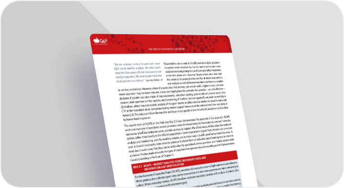 C The Cash Learning Partnership THE STATE OF THE WORLD’S CASH REPORT “We are actively moving forward with more Respondents saw a need to simplify market analysis guidance light touch market analysis. We often don’t to enable wider adoption by country teams and ensure more need the Emergency Market Assessment and rapid decisions regarding the use of cash (and other modalities) Analysis any more. We need simpler tools that in the first phase of a response. Respondents were clear that local partners can take on.” Save the Children, UK this needs to be proportionate and that in-depth assessments and analyses would still be needed where markets are complex or are less understood. However, where it is quite clear that markets can and do work, a lighter touch, common- sense approach may be more relevant. Some also highlighted the potential for speedier – and still effective – decisions if greater use were made of macroeconomic, and other existing government and private sector data sources (and expertise) on the capacity and functioning of markets. Such an approach was used successfully in Zimbabwe, where macroeconomic analysis of the grain market enabled decision makers to move forward with CTP at the household level, complemented by market support measures at the national level (see case study in Annex 2.3). This data can inform the need for and focus of any specific (more micro-level) assessment and analysis by humanitarian agencies. The recent work of ACAPS in this field (see Box 2.1) also demonstrates the potential of this approach. ACAPS’ 64 work is an example of specialized service provision under the Humanitarian to Humanitarian concept, whereby numerous small humanitarian actors provide services to support the effectiveness of the wider humanitarian system, rather than directly to the affected populations. Some respondents argued that activities such as market analysis and monitoring, and the resulting outputs, are in many ways a ‘public good’ in humanitarian work. As such, it doesn’t necessarily make sense to continue to situate them at individual operational agency or consortia level, but in such a way that they can be undertaken by specialized service providers, and thereby reach a wider audience. This has implications for the types of capacities that agencies should be building as part of preparedness. Capacity building is the focus of Chapter 3. BOX 2.1 ACAPS – MARKET ANALYSIS USING SECONDARY DATA AND INFORMATION GAP IDENTIFICATION For the Assessment Capacities Project (ACAPS), secondary data analysis across multiple sources is a specialization. Whilst primary data collection post-crisis can be more precise, it is also more expensive and time-consuming to collect. When analysing markets, ACAPS therefore combines secondary analysis with analysis of primary data, where the latter is required to fill information gaps. A working group set up by ACAPS has developed a framework for analysing markets based on such data sources, covering problem analysis (how far needs relate to market failure, and constraints to market functioning), response analysis (operational environment), and information gap analysis (identifying and prioritizing gaps). This has been tested in Ukraine, and then piloted in Haiti in the aftermath of Hurricane Matthew. It generated a ‘Multi-Sector Market Environment Analysis’ to determine the extent to which markets could meet the basic needs of the affected population. The analysis was completed within nine days of the hurricane making landfall, and was considered to be timely and useful for informing response by humanitarian actors. Topics covered included demand, supply, prices and trends, lessons learned from past responses, the macro-environment, projections for the next six months, and information landscape, gaps and recommendations. Source: ACAPS (2016) Multi-Sector Market Environment Analysis Haiti; ACAPS (2016) Market Systems in Crisis: Analysis Framework; interview with ACAPS. 64 ACAPS (2016) Improving Assessments. www.acaps.org 38