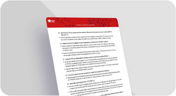 C The Cash Learning Partnership THE STATE OF THE WORLD’S CASH REPORT 2.2 Iden tify how CTP can achieve the best results in different technical sectors and across sectors. [GFA 2.3, GB 1.6 & 1.7] — Technical specialists, including clusters, should lead work to identify and promote how CTP can best contribute to outcomes in different sectors. Explore the added value, and limitations, of MPGs in different contexts. 2.3 Donors should work together to ensure appropriate consideration of CTP. [GFA 2.4, GB 1.1] — Donors should encourage implementing agencies to always consider using CTP, to achieve the best strategic outcomes for crisis-affected people. This includes considering how actors can collaborate in the most effective and efficient ways. — Donors may benefit from developing shared principles for high-quality CTP. They should consider how risk can be managed in different contexts and appropriately shared across actors. 3.1 Integrate CTP into organizations’ strategies, systems, processes and staffing [GFA 3.2] — All relevant staff should be equipped to use CTP appropriately, including through the structured integration of CTP into organizational plans, systems, processes and guidance. This is the single most significant step in driving the uptake of CTP and requires time, consistent resourcing and leadership. — Agencies should make strategic decisions about the role they intend to play in CTP. Donors should resource capacity building and institutionalization processes. 3.2 Fund and support national organizations to build their capacity for CTP [GFA 3.5] — National organizations should be supported by international actors to accelerate their efforts to build capacities for CTP. National agencies can also benefit from sharing experience, tools and approaches. 3.3 Build individual competencies in CTP. [GFA 3.3] — All actors should invest in strengthening the competencies of individual staff and practitioners in CTP. CTP competencies should be built into existing job roles, rather than siloed as separate ‘CTP experts’. — CTP should be integrated within existing initiatives to develop skills and talent in the humanitarian sector. All agencies can benefit from common approaches such as shared materials based on best practice. Competencies should be enhanced with experience from outside the humanitarian sector. 4.1 Desig n and implement cash-based assistance to contribute as effectively and efficiently as possible to strategic outcomes. [GFA 4.2, 4.3 & 4.4] — Agencies should systematically ensure that CTP is designed and implemented on the basis of the best available standards and evidence. Programmes should be designed to contribute to strategic outcomes for the whole humanitarian response, in line with beneficiaries’ preferences. Agencies should assume that this will involve collaborating with other actors, rather than operating independently. — Humanitarian programmes should build on existing infrastructure and systems where possible, such as social protection systems, local networks or financial services and communications providers. 4.2 Develop common tools for managing the quality of CTP. [GFA 4.1]. — Agencies, donors and coordinating bodies should improve the common tools available to manage the quality of CTP, at global, national and operational levels. Tools should link to shared definitions of quality and include: outcome indicators, standards, guidance and operational tools. — The process of developing tools should involve a range of actors bringing different perspectives. Tools will need to be systematically updated and promoted. 4.3 I ntegrate CTP into existing mechanisms for managing the quality of humanitarian action. [GFA 4.2] — CTP should be integrated into existing and new humanitarian standards, guidance, frameworks and initiatives. This includes areas such as: humanitarian programme cycles, coordination processes and funding decisions. This should be undertaken with due account paid to best practices from across the humanitarian sector, with lessons shared between organizations and countries. 13