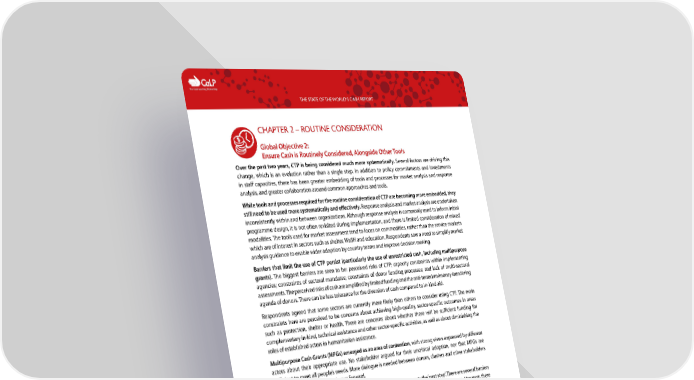 C The Cash Learning Partnership THE STATE OF THE WORLD’S CASH REPORT CHAPTER 2 – ROUTINE CONSIDERATION Global Objective 2: Ensure Cash is Routinely Considered, Alongside Other Tools Over the past two years, CTP is being considered much more systematically. Several factors are driving this change, which is an evolution rather than a single step. In addition to policy commitments and investments in staff capacities, there has been greater embedding of tools and processes for market analysis and response analysis, and greater collaboration around common approaches and tools. While tools and processes required for the routine consideration of CTP are becoming more embedded, they still need to be used more systematically and effectively. Response analysis and market analysis are undertaken inconsistently within and between organizations. Although response analysis is commonly used to inform initial programme design, it is not often revisited during implementation, and there is limited consideration of mixed modalities. The tools used for market assessment tend to focus on commodities, rather than the service markets which are of interest in sectors such as shelter, WaSH and education. Respondents saw a need to simplify market analysis guidance to enable wider adoption by country teams and improve decision making. Barriers that limit the use of CTP persist (particularly the use of unrestricted cash, including multipurpose grants). The biggest barriers are seen to be: perceived risks of CTP; capacity constraints within implementing agencies; constraints of sectoral mandates; constraints of donor funding processes; and lack of multi-sectoral assessments. The perceived risks of cash are amplified by limited funding and the anti-terrorism/money laundering agenda of donors. There can be less tolerance for the diversion of cash compared to in-kind aid. Respondents agreed that some sectors are currently more likely than others to consider using CTP. The main constraints here are perceived to be concerns about achieving high-quality, sector-specific outcomes in areas such as protection, shelter or health. There are concerns about whether there will be sufficient funding for complementary in-kind, technical assistance and other sector-specific activities, as well as about diminishing the roles of established actors in humanitarian assistance. Multipurpose Cash Grants (MPGs) emerged as an area of contention, with strong views expressed by different actors about their appropriate use. No stakeholder argued for their uncritical adoption, nor that MPGs are sufficient to meet all people’s needs. More dialogue is needed between donors, clusters and other stakeholders to agree on opportunities and ways forward. For many implementing agencies, the use of CTP across sectors represents the ‘next step’. There are several barriers to this, including practical challenges in terms of cross-sectoral coordination and engagements. However, there has been progress, including tools and processes for a ‘Basic Needs Approach’ (BNA) being developed and tested by UNHCR and others. Some respondents suggested that reorienting thinking around ‘basic needs’ could support better integration of sectors, presenting MPGs as a common platform and the foundation for meeting sector- specific needs. At the same time, some were cautious about the limited evidence available to establish ‘proof of concept’ and the need to monitor outcomes. 7