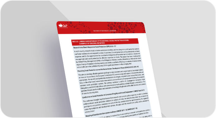C The Cash Learning Partnership THE STATE OF THE WORLD’S CASH REPORT BOX 5.5 LINKING HUMANITARIAN CTP TO NATIONAL SOCIAL PROTECTION SYSTEMS: EXAMPLES OF ONGOING INITIATIVES 1 Research into Shock-Responsive Social Protection (DFID 2015–17) A multi-country research study to better understand whether, and how, long-term social protection systems can foster resilience to and respond to crises. It examines: (i) social protection and its potential role in shock response; and (ii) the opportunities for coordination/integration of humanitarian interventions, disaster risk management and social protection for effective responses to shocks. The project has been implemented by Oxford Policy Management (OPM) in the Philippines, Pakistan, Lesotho, Mozambique, Mali and the Sahel region. A range of outputs including country case studies, a synthesis of findings, an extensive literature review, and a toolkit are to be published by early 2018 to guide practitioners in this emerging field. Providing Social Protection across the Humanitarian–Development Nexus (DEVCO/ECHO 2016–18) This aims to develop a flexible guidance package to raise awareness and support practical recommendations on how, on the one hand, the European Commission (EC) can encourage and support, whenever feasible and appropriate, the use of social protection mechanisms to mitigate, respond to and recover from crises, and how, on the other hand, humanitarian interventions can contribute to the progressive building of sustainable national social protection systems. The primary audience is staff in EC Headquarters, European Union Delegations and ECHO field offices, with some resources made publicly available through a web platform. The guidance focuses on the realities and constraints of working in fragile and conflict affected areas and contexts of cross-border migration. Conference on Social Protection in Contexts of Fragility and Forced Displacement (UNICEF Sept 2017) This conference brought together lessons from research and concrete policy responses, in order to develop evidence-based social protection solutions in contexts of crisis. An outcome document was endorsed by participants and provides consensus on some of the key considerations for operationalizing this approach across humanitarian and development spheres, the gaps and the research and policy actions needed to 2 address them. Mapping of social protection system readiness (UNICEF 2017–18; UNHCR 2017–18) Both UNICEF and UNHCR are aiming to explore how to use existing or nascent social protection systems – especially cash transfers – to channel humanitarian assistance during emergencies and protracted crises. — UNHCR is aiming to gain a better understanding of existing cash-based social transfers and safety nets in 15–20 UNHCR countries of operation through a light-touch mapping exercise to scope out the possible entry points for supporting displaced populations, for further detailed analysis in 2018. — UNICEF piloted a light-touch survey tool to assess the ‘readiness’ of national social protection systems to support shock response. This has formed the basis of a more detailed tool which assesses the social protection system, the humanitarian system and capacities of implementing agencies – currently being piloted in the Central Asia region (Tajikistan and Armenia). 1 Visit the project web page for the research outputs. 2 UNICEF (2017) Conference on Social Protection in Contexts of Fragility and Forced Displacement: Outcome Document. Experiences from research and practice are generating valuable lessons to inform policy debates on the feasibility and appropriateness of using, and/or building national social protection systems as part of humanitarian cash assistance. Box 5.6 summarizes the key lessons emerging from research and experiences to date. 75