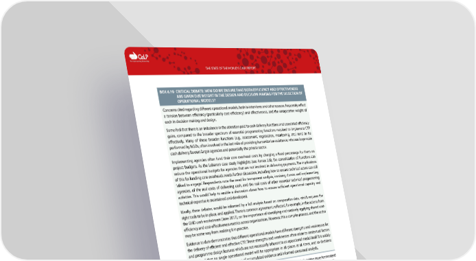 C The Cash Learning Partnership THE STATE OF THE WORLD’S CASH REPORT BOX 6.10 CRITICAL DEBATE: HOW DO WE ENSURE THAT BOTH EFFICIENCY AND EFFECTIVENESS ARE GIVEN DUE WEIGHT IN THE DESIGN AND DECISION-MAKING FOR THE SELECTION OF OPERATIONAL MODELS? Concerns cited regarding different operational models, both in interviews and other sources, frequently reflect a tension between efficiency (particularly cost-efficiency) and effectiveness, and the comparative weight of each in decision making and design. Some feel that there is an imbalance in the attention paid to cash delivery functions and associated efficiency gains, compared to the broader spectrum of essential programming functions required to implement CTP effectively. Many of these broader functions (e.g., assessment, registration, monitoring, etc.) tend to be performed by NGOs, often involved in the last mile of providing humanitarian assistance, whereas large-scale cash delivery favours larger agencies and potentially the private sector. Implementing agencies often fund their core overhead costs by charging a fixed percentage for them on project budgets. As the Lebanon case study highlights (see Annex 2.8), the consolidation of functions can reduce the operational budgets for agencies that are not involved in delivering payments. The implications of this for funding core overheads needs further discussion, including how to ensure technical actors can still ‘afford to engage’. Respondents note the need for transparent analysis, involving donors and implementing agencies, of the real costs of delivering cash, and the real costs of other essential technical programming activities. This would help to enable a discussion about how to ensure sufficient operational capacity and technical expertise is maintained and developed. Ideally, these debates would be informed by a full analysis based on comparative data, which requires the right tools to be in place, and applied. There is common agreement, reflected, for example, in the actions from the GHD cash workstream (June 2017), on the importance of identifying and routinely applying shared cost- efficiency and cost-effectiveness metrics across organizations. However, this a complex process, and the sector may be some way from realizing it in practice. Evidence to date demonstrates that different operational models have different strengths and weaknesses for the delivery of efficient and effective CTP. These strengths and weaknesses often relate to contextual factors and programme design features which are not necessarily inherent to an operational model itself. It is widely recognized that no single operational model will be appropriate in all places at all times, and so decisions should always be based on a mixture of accumulated evidence and informed contextual analysis. Implications of evolving operational models for the humanitarian system: Models that drive more harmonized cash delivery can challenge the established interests and roles of actors within the humanitarian system. The push to separate cash delivery from other programming components, and projections that, in future, cash delivery may be increasingly contracted directly to the private sector, have led some organizations (particularly NGOs) to question further investment in cash delivery capacities (see Chapter 3 for more on this). Instead, they are considering where they might add more value in terms of specialist and technical skills, and local engagement. The development of the Collaborative Cash Delivery Platform (CCD) – see Box 6.8 – is in many ways reflective of these concerns. As noted in Chapter 3, the Grand Bargain is committed to making humanitarian action as local as possible. Respondents remarked that this approach is in tension with operational models that increase the scale of CTP through more streamlined models that involve fewer agencies. How this tension plays out in practice will depend both on how the overall localization agenda and related commitments progress, along with efforts to ensure that national and local organizations are engaged in evolving operational models. As highlighted in the case studies for Somalia and Lebanon (see Annexes 2.7 and 2.8), there is a need for greater donor coordination on approaches for more collaborative cash delivery. Donors are often not seen to be taking steps to pool their funding for CTP, or sharing the same approach for operational models for cash delivery, and have different criteria for reporting. This creates confusion among agencies, can contribute to duplications or differential treatment of people with similar vulnerabilities, and undermines the potential of more collaborative approaches. Greater harmonization and coordination among donors is likely to drive better and more expansive collaboration between those implementing CTP. 89