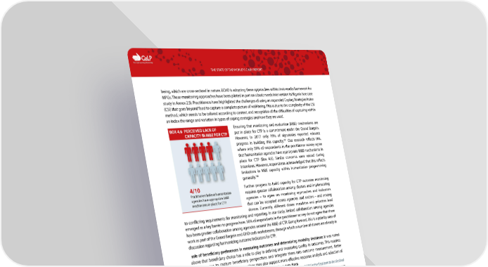 C The Cash Learning Partnership THE STATE OF THE WORLD’S CASH REPORT being, which are cross-sectoral in nature. ECHO is adopting these approaches within their results framework for MPGs. These monitoring approaches have been piloted in part on a basic needs intervention in Nigeria (see case study in Annex 2.5). Practitioners have highlighted the challenges of using an expanded Coping Strategies Index (CSI) that goes beyond food to capture a complete picture of well-being. This is due to the complexity of the CSI method, which needs to be tailored according to context, and recognition of the difficulties of capturing within an index the range and variation in types of coping strategies and how they are used. BOX 4.6 PERCEIVED LACK OF Ensuring that monitoring and evaluation (M&E) mechanisms are CAPACITY IN M&E FOR CTP put in place for CTP is a commitment under the Grand Bargain. However, in 2017 only 19% of signatories reported relevant 101 progress in building this capacity. Our research reflects this, where only 39% of respondents in the practitioner survey agree that humanitarian agencies have appropriate M&E mechanisms in place for CTP (Box 4.6). Similar concerns were voiced during interviews. However, respondents acknowledged that this reflects limitations in M&E capacity within humanitarian programming 102 generally. 4/10 Further progress to build capacity for CTP outcome monitoring Practitioners believe humanitarian requires greater collaboration among clusters and implementing agencies have appropriate M&E agencies – to agree on monitoring approaches and indicators mechanisms in place for CTP. that can be accepted across agencies and sectors – and among donors. Currently, different donor mandates and priorities lead to conflicting requirements for monitoring and reporting. In our study, limited collaboration among agencies emerged as a key barrier to progress here. 56% of respondents in the practitioner survey do not agree that there has been greater collaboration among agencies around the M&E of CTP. Going forward, this is a priority area of work as part of the Grand Bargain and GHD cash workstreams, through which a number of donors are already in discussion regarding harmonizing outcome indicators for CTP. role of beneficiary preferences in measuring outcomes and determining modality decisions: It was noted above that beneficiary choice has a role to play in defining and measuring quality in outcomes. This requires effective ways to capture beneficiary perspectives and integrate them into outcome measurement. Better understanding of beneficiary perspectives may also support more effective response analysis and selection of programming modalities. Implementing organizations collect data from “M&E is the first item to be slashed beneficiaries to monitor and evaluate their own projects, but this may not from the budget”. Anonymous allow the necessary breadth or neutrality to properly assess preferences and perspectives at the aggregate response level. The Cash Barometer (Box 4.7), which is being piloted in 2017, aims to help fill this gap. Findings from the first pilot in Afghanistan revealed that beneficiaries prefer cash compared to other modalities. It also revealed that in some cases, beneficiaries incorrectly thought assistance was delivered by government, which could have political implications. 101 GPPI (2017) Independent Grand Bargain Report. https://reliefweb.int/report/world/independent-grand-bargain-report 102 Similar conclusions are reached in CaLP’s CTP Monitoring Guidance (2017) – include resourcing of and the capacity to undertake monitoring activities. 62