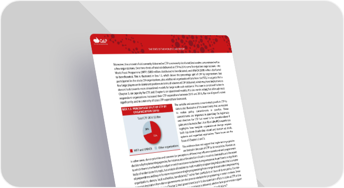 C The Cash Learning Partnership THE STATE OF THE WORLD’S CASH REPORT Moreover, the amount of aid currently disbursed as CTP is not evenly distributed, but is rather, concentrated within a few organizations. Over two-thirds of total aid disbursed as CTP in 2016 came from just two organizations – the World Food Programme (WFP) ($880 million distributed to beneficiaries), and UNHCR ($688 million distributed to beneficiaries). This is illustrated in Box 1.5, which shows the percentage split of CTP by organizations that participated in the study (34 organizations, plus additional organizational data from the FTS). It suggests that a few large players are in dominant positions in terms of volumes of CTP disbursed, which may have implications as donors look towards more streamlined models for large-scale cash assistance. This issue is considered further in Chapter 3, on capacity for CTP, and Chapter 6, on operational models. It is also worth noting that although most respondent organizations increased their CTP expenditure between 2015 and 2016, the rate of growth varied significantly, and in a minority of cases CTP expenditure decreased. BOX 1.5 PER CENTAGE SPLIT OF CTP BY The variable and unevenly concentrated growth in CTP to ORGANIZATION (2016) date is also illustrative of the investments that are needed Total CTP 2016 $2.8bn to realize policy commitments in practice. These commitments are important in providing the legitimacy and direction for CTP but need to be operationalized if 28% gains are to be made. Box 1.6 on RI and the IRC’s experiences highlights how tangible organizational change requires 72% both top-down (leadership vision) and bottom-up (tools, systems and expertise) approaches. These issues are the focus of Chapters 2 and 3. WFP and UNHCR Other organizations This evidence does not suggest that implementing agencies are limited in the scale of CTP by donor policies. However, as in other areas, donor priorities and concerns (or perceptions of these) may influence operational and programmatic decisions by implementing agencies, for instance, about the selection of cash or vouchers. A related issue is the extent to which there is the flexibility to adjust or switch assistance modalities during a response. As yet there is no significant body of evidence on this topic, but analysis of enablers to multi-modality programming indicate that this is a matter of preparedness and buy-in for more responsive and agile programming from a range of stakeholders (implementing 55 organizations, donors, local authorities, beneficiaries), rather than particularly an issue of donor policy. Counter- terrorism legislation from donor governments can also pose an obstacle for programming in certain contexts. These issues are considered further in Chapter 2. Host government buy-in is also essential in efforts to scale up CTP, and as with other areas requiring reform of how humanitarian assistance is delivered, whether host governments support or block changes relating to CTP is likely to depend on country-specific factors and implications.56 55 CRS/CaLP (2017) Cash or in-kind? Why not both? Response Analysis Lessons from Multimodal Programming. 56 GPPI (2016) Drivers and Inhibitors of Change in the Humanitarian System. 29