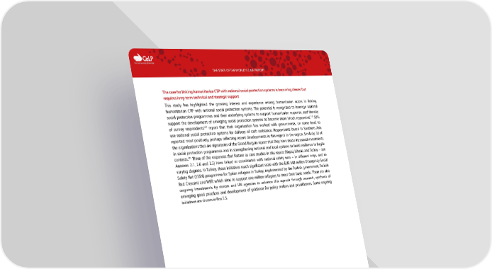 C The Cash Learning Partnership THE STATE OF THE WORLD’S CASH REPORT The case for linking humanitarian CTP with national social protection systems is becoming clearer but requires long-term technical and strategic support This study has highlighted the growing interest and experience among humanitarian actors in linking humanitarian CTP with national social protection systems. The potential is recognized to leverage national social protection programmes and their underlying systems to support humanitarian response, and thereby 119 support the development of emerging social protection systems to become more ‘shock responsive’. 50% 120 of survey respondents report that their organization has worked with governments, on some level, to use national social protection systems for delivery of cash assistance. Respondents based in Southern Asia reported most positively, perhaps reflecting recent developments in this regard in the region. Similarly, 32 of the organizations that are signatories of the Grand Bargain report that they have made increased investments in social protection programmes and in strengthening national and local systems to build resilience in fragile 121 contexts. Three of the responses that feature as case studies in this report (Nepal, Liberia and Turkey – see Annexes 2.1, 2.6 and 2.2) have linked or coordinated with national safety nets – in different ways, and to varying degrees. In Turkey, these initiatives reach significant scale with the EUR 348 million Emergency Social Safety Net (ESSN) programme for Syrian refugees in Turkey, implemented by the Turkish government, Turkish Red Crescent and WFP, which aims to support one million refugees to meet their basic needs. There are also ongoing investments by donors and UN agencies to advance this agenda through research, synthesis of emerging good practices and development of guidance for policy makers and practitioners. Some ongoing initiatives are shown in Box 5.5. 119 There are several different ways in which humanitarian cash assistance can link with national social protection systems. Growing literature on this topic highlights consensus on some common ways in which social protection (particularly social transfer programmes) can bridge the development and humanitarian divide. The DFID-funded research into shock-responsive social protection (see Box 5.5) has developed a useful typology that summarizes these approaches: i) Vertical expansion: temporarily increasing the benefit value or duration of the benefit provided on an existing social protection programme, for all or some of the existing beneficiaries. This can be achieved via an adjustment of transfer amounts, or through the introduction of extraordinary payments or transfers. The extra support is provided as an integral part of the existing intervention. ii) Horizontal expansion: temporary inclusion of new, disaster affected, beneficiaries into a social protection programme. This could be done via the extension of the programme’s geographical coverage to underserved areas, an extraordinary enrolment campaign to rapidly enroll those who fit programme criteria and who have been affected, or modification/relaxation of eligibility criteria to allow more people to benefit.iii) Piggybacking: using a social protection programme’s administrative framework or systems to deliver assistance, but running the response programme separately. This could be use of a specific programme’s beneficiary list, national registries or databases of households underpinning social protection programmes, a particular payment mechanism, or social protection staff. iv) Alignment: an emergency response is deliberately designed to align with another (actual or emerging/potential future) programme or system. This could be greater alignment of humanitarian interventions into something more predictable and ‘systemic’ or alignment of a response programme with an existing or future social protection programme, to facilitate potential integration and national ownership in the future. 120 Note: here n = only 187 respondents. 121 GPPI (2017) Independent Grand Bargain Report. https://reliefweb.int/report/world/independent-grand-bargain-report 74
