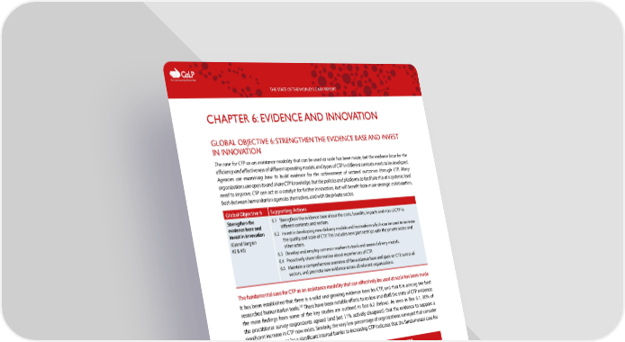 C The Cash Learning Partnership THE STATE OF THE WORLD’S CASH REPORT CHAPTER 6: EVIDENCE AND INNOVATION GLOBAL OBJECTIVE 6: STRENGTHEN THE EVIDENCE BASE AND INVEST IN INNOVATION The case for CTP as an assistance modality that can be used at scale has been made, but the evidence base for the efficiency and effectiveness of different operating models, and types of CTP in different contexts needs to be developed. Agencies are examining how to build evidence for the achievement of sectoral outcomes through CTP. Many organizations are open to and share CTP knowledge, but the policies and platforms to facilitate this at a systemic level need to improve. CTP can act as a catalyst for further innovation, but will benefit from more strategic collaboration, both between humanitarian agencies themselves, and with the private sector. Global Objective 6 Supporting Actions Strengthen the 6.1 Strengthen the evidence base about the costs, benefits, impacts and risks of CTP in evidence base and different contexts and sectors. invest in innovation 6.2 Invest in developing new delivery models and innovations which can be used to increase (Grand Bargain the quality and scale of CTP. This includes new partnerships with the private sector and #2 & #3) other actors. 6.3 Develop and employ common markers to track and assess delivery models. 6.4 Proactively share information about experiences of CTP. 6.5 Maintain a comprehensive overview of the evidence base and gaps on CTP, across all sectors, and promote new evidence across all relevant organizations. The fundamental case for CTP as an assistance modality that can effectively be used at scale has been made It has been established that there is a solid and growing evidence base for CTP, and that it is among the best researched humanitarian tools.123 There have been notable efforts to review and distil the state of CTP evidence; the main findings from some of the key studies are outlined in Box 6.2 (below). As seen in Box 6.1, 80% of the practitioner survey respondents agreed (and just 11% actively disagreed) that the evidence to support a significant increase in CTP now exists. Similarly, the very low percentage of organizations surveyed that consider the lack of evidence to be a significant internal barrier to increasing CTP indicates that the fundamental case for CTP has been made. BOX 6.1 SUFFICIENT EVIDENCE IS AVAILABLE ON THE ‘PROOF OF CONCEPT’ FOR CTP 80% 6% Practitioners agree that sufficient Organizations saw a lack of evidence on the evidence is available to make the efficiency, effectiveness and appropriateness case for a significant increase in of cash as a significant barrier to effective and the use of CTP. extensive usage of CTP within their organization and their readiness for CTP. 123 ODI (2015) Report of the High Level Panel on Cash Transfers www.odi.org/sites/odi.org.uk/files/odi-assets/publications-opinion-files/9828.pdf 79