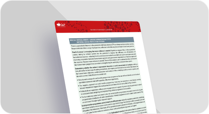 C The Cash Learning Partnership THE STATE OF THE WORLD’S CASH REPORT BOX 5.6 CRITICAL DEBATE – LINKING HUMANITARIAN CTP TO NATIONAL SOCIAL PROTECTION SYSTEMS There is a great deal of interest in the potential to link humanitarian CTP to national social protection systems. Respondents identified a range of perspectives, reflected in the following lessons from research and practice. Proof of concept is emerging, but more evidence is needed: Experience suggests that, in the appropriate context, linking to national systems has the potential to improve the efficiency and effectiveness of humanitarian response – reducing the time and resources needed to establish new systems and processes and improving cooperation between humanitarian agencies and government departments on broader aspects of the response. However more evidence is needed. There is little evidence yet to substantiate the contribution that humanitarian programmes can make to strengthening the underlying social protection system. Determining whether the context is ‘appropriate’ depends on careful assessment and analysis: making a link will not be the best way of working everywhere, and requires an informed decision to be taken based on the humanitarian objectives, careful assessment and analysis of the underlying social protection system, and the wider context. Critical factors to consider are: — Maturity and coverage of social transfer programmes: programmes that are well established, and with robust operational processes and staff capacities, offer more opportunity. — The targeting approach on social transfer programmes: there may be extensive or only limited overlap between households targeted for social protection and those that are worst affected by a disaster. — Political will and regulations: without prior engagement and support of government departments involved in social protection, designing and implementing a linked programme is not possible. — The humanitarian context and needs to be met: social transfer programmes are geared towards the regular and predictable distribution of cash to beneficiaries. A linked programme is more suited to meet needs that are addressed through regular repeated support. Social protection programmes can be linked to in different ways: national programmes and their underlying operational systems and processes can be used in ways that leverage their strengths whilst accounting for and mitigating their limitations. If elements of the operational system present bottlenecks, or if design features are not well suited for humanitarian assistance, these could potentially be bypassed, or adapted. Coordination of linked programmes can be challenging in practice: linking humanitarian assistance to social protection systems requires the involvement of a range of actors with different mandates, concerns and priorities. It may need to bring together social protection and humanitarian response thematic areas within governments, donors and international organizations that more commonly operate as separate departments, with different mandates, sources of funding, and lines of reporting. It may also involve government departments responsible for managing any underlying databases/registries and setting programme regulations. Establishing ways of working and securing buy-in of these various stakeholders, ex-post, is not conducive to a timely response. It also raises the question of how to integrate such activities with the agenda for developing common systems for cash delivery, since one focuses on using, building or strengthening nationally owned systems whilst the other prioritizes the development of a separate, parallel system. While there are potential advantages to linking with national social protection systems to deliver humanitarian assistance, this way of working will also present challenges, just as with any other programme. Social protection and humanitarian response have different objectives, and tools or designs to support one will not always be the best way of achieving the other. Political motivations can influence design features such as targeting, or setting of the transfer value, and the ‘politically acceptable’ approach may not necessarily be the most effective from a humanitarian perspective. Engagement with and capacity building of national governments, whilst desirable, is not always a smooth process – particularly if departments are unfamiliar with the requirements or principles of humanitarian response. There can be difficulties faced in including refugees – such as challenges in recognition of refugee status, legal and regulatory barriers to accessing state services, among others (lack of information, language barriers, discrimination, etc.). Source: Authors, synthesizing findings from the global research and guidance initiatives mentioned in Box 5.5. 76