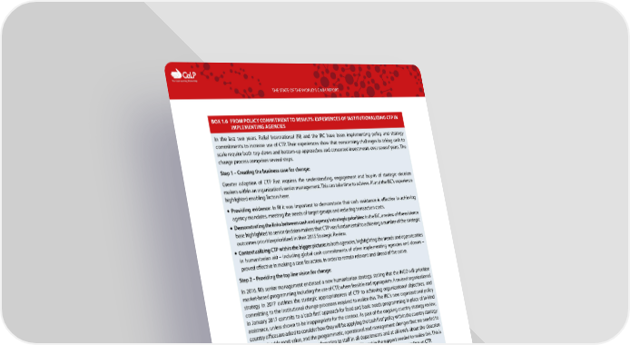 C The Cash Learning Partnership THE STATE OF THE WORLD’S CASH REPORT BOX 1.6 FROM POLICY COMMITMENT TO RESULTS: EXPERIENCES OF INSTITUTIONALIZING CTP IN IMPLEMENTING AGENCIES In the last two years, Relief International (RI) and the IRC have been implementing policy and strategy commitments to increase use of CTP. Their experiences show that overcoming challenges in taking cash to scale require both top-down and bottom-up approaches and concerted investments over several years. The change process comprises several steps. Step 1 – Creating the business case for change: Greater adoption of CTP first requires the understanding, engagement and buy-in of strategic decision makers within an organization’s senior management. This can take time to achieve. RI and the IRC’s experience highlighted enabling factors here: — Providing evidence: In RI it was important to demonstrate that cash assistance is effective in achieving agency mandates, meeting the needs of target groups and reducing transaction costs. — Demonstrating the links between cash and agency’s strategic priorities: In the IRC, a review of the evidence base highlighted to senior decision makers that CTP was fundamental to achieving a number of the strategic outcomes prioritizeprioritized in their 2015 Strategic Review. — Contextualizing CTP within the bigger picture: in both agencies, highlighting the trends and opportunities in humanitarian aid – including global cash commitments of other implementing agencies and donors – proved effective in making a case for action, in order to remain relevant and ahead of the curve. Step 2 – Providing the top line vision for change: In 2016, RI’s senior management endorsed a new humanitarian strategy, stating that the INGO will prioritize market-based programming including the use of CTP, where feasible and appropriate. A revised organizational strategy in 2017 outlines the strategic appropriateness of CTP to achieving organizational objectives, and committing to the institutional change processes required to realize this. The IRC’s new organizational policy in January 2017 commits to a ‘cash first’ approach for food and basic needs programming in place of in-kind assistance, unless shown to be inappropriate for the context. As part of the ongoing country strategy review, country offices are asked to consider how they will be applying the ‘cash first’ policy within the country strategy – where it adds most value, and the programmatic, operational and management changes that are needed to realize this. These changes have confirmation to staff in all departments and at all levels about the direction that the organization is taking, and that the organization will invest in the support needed to realize this. This is important for shifting mindsets and building confidence, to remove internal barriers to scaling up CTP. Step3 – Realizing the top-down vision through bottom up strategies: Achieving more systematic, large-scale and effective adoption of cash assistance requires that tools, processes, systems and expertise are developed at all levels. Formalizing organizational commitments to CTP, through inclusion in departmental and individual objectives, work plans and budgets, is helping to realize the necessary investments – in time, money and human resources – that are needed to take cash to scale. Targeted and hands-on support strategies at implementation level, intended to increase capacity and confidence, and which celebrate and communicate successes, are also critical to enabling this change. Source: Interviews with RI and the IRC. Less than half of respondents in the practitioner survey believe that there has been a strengthening of support for CTP among the public in donor countries. From this research, it was not possible to determine whether limited support among the public in donor countries is a contributing factor to the relatively slow growth of CTP. This is something that merits further research and analysis. However, concerns about negative public opinion have the potential to influence decisions made by donor governments. Donor governments are concerned that public support for CTP is weak, and that the public may perceive greater risks with cash. Even a small scandal around CTP could be used by unsympathetic political groups to fuel campaigns against humanitarian aid as a whole. At the same time, host governments must maintain support for aid assistance to people affected by crisis. 30