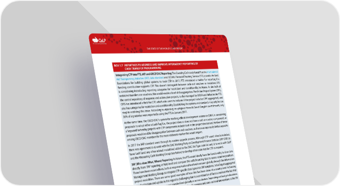 C The Cash Learning Partnership THE STATE OF THE WORLD’S CASH REPORT BOX 1.7 INITIATIVES TO ADDRESS AND IMPROVE INTERAGENCY REPORTING OF CASH TRANSFER PROGRAMMING Integrating CTP into FTS, IATI and OECD DAC Reporting: The Counting Cash study found that the International Aid Transparency Initiative (IATI) data standard and OCHA’s Financial Tracking Service (FTS) provide the best foundations for building global systems to track CTP. In 2017, FTS introduced a marker for reporting if a funding contribution supports CTP. This doesn’t distinguish between cash and vouchers as modalities; FTS is considering introducing reporting categories for ‘restriction’ and ‘conditionality’ in future. As the bulk of restricted transfers are vouchers, this would enable a level of disaggregation. The Online Project System (OPS), the central repository of response and action plan projects, is also managed by OCHA and linked to the FTS. OPS has introduced a field for CTP, which asks users to indicate if the project includes CTP (aggregated), and also has categories for restriction and conditionality. Establishing the systems and standards may only be one step in resolving this issue. According to reporting on progress towards Grand Bargain commitments, only 36% of signatories were reportedly using the FTS in January 2017. At the same time, the OECD DAC’s system for tracking official development assistance (ODA) is considering proposals to adopt either a ‘cash flag’ (i.e., the project does or does not have a cash or voucher component), or a ‘keyword’ (whereby projects with CTP components include ‘cash’ in the project description). Neither of these proposals would enable disaggregation between cash and vouchers, as there was reportedly limited appetite among OECD DAC members for the more elaborate marker this would require. In 2017 the IATI standard went through its routine upgrade process. Although CTP wasn’t directly included, there was agreement to a) work with the DAC Working Party on Development Finance Statistics (WP-STAT) to have ‘cash’ (and any other related modalities) added to the DAC Aid Type code-list and, b) to work with CaLP and the Measuring Cash Working Group (see below) to develop other code-lists for CTP as required. 3W (Who does What, Where) Reporting: In future, the FTS would ideally have the functionality to draw data directly from ‘3W’ reporting at field level and compare this with financing data to assess actual expenditure. There have been recent efforts, both at response/national level and overseen globally through the Information Management Working Group, to integrate CTP-specific data types into 3W templates, including disaggregated project modalities. There are some good examples of how this has been done at a country level. Achieving standardization and uptake in this regard is challenging due to a combination of factors, not least the fact that 3W reporting and templates are not standardized globally or across clusters. Separating out budget allocations in multi-modality projects, and effective reporting of multi-purpose and cross-sectoral interventions at the 3W level, are also problematic. Measuring Cash Working Group: CaLP established this group in the latter part of 2017 as a specialized platform for sector-wide discussion and collective action for CTP tracking and reporting. Membership of the group includes NGOs, UN agencies, donors, and representatives of the interagency reporting systems. This group builds on the earlier work of the Humanitarian Exchange Language (HXL) Cash & Markets Working Group, whose focus was on identifying recommended CTP data types for inclusion in reporting (including for 3W templates), and developing associated HXL hashtags. Source: CaLP (2017) Briefing Note on Measuring Cash Transfer Programming; Measuring Cash Working Group (discussions, minutes, etc.). Despite this level of activity and interest in improving the measurement of CTP (and other modalities), several technical and policy issues are constraining progress. On a practical level, existing reporting systems have not generally been designed to include CTP, and adaptations to include it may be complicated. For example, the British Red Cross (BRC) noted that their legacy systems are set up for goods, so bringing cash in is not straightforward. While this may be an internal challenge for agencies, in general, resolving the key issues and finding agreement requires coordinated action across a wide range of agencies and systems, which is a challenge in itself. An OCHA 62 representative noted that achieving this level of consistent evolution across the many different information systems involved is likely to take a number of years. 62 Comment made at the Grand Bargain cash workshop, 1 June 2017. 32