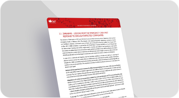 C The Cash Learning Partnership THE STATE OF THE WORLD’S CASH REPORT 2.3 ZIMB ABWE – LESSONS FROM THE ‘EMERGENCY CASH FIRST RESPONSE’ TO DROUGHT-AFFECTED COMMUNITIES Two seasons of failed rains in 2015 and 2016 led to an acute food insecurity crisis in Zimbabwe, which reached emergency levels in February 2016. The drought crisis reduced household subsistence production, income and livelihood activities, constrained access to food, and contributed to livestock deaths. From August 2015 to May 2017, CARE Zimbabwe, in partnership with World Vision International (WVI) and the UK Department for International Development (DFID) implemented a monthly unconditional and unrestricted cash transfer intervention to address basic food and nutrition needs, enable households to cope with food shocks and enhance asset retention. In a context where in-kind food aid still dominates most emergency responses, this reached over 400,000 people and is by far the largest humanitarian cash transfer intervention carried out in Zimbabwe. In June 2016, a national cash liquidity crisis hit Zimbabwe, peaking in October and leading to a shortage of physical currency across the country, limits on withdrawals, and restrictions on transfers outside of Zimbabwe. Despite this, CARE successfully continued providing cash transfers, which were delivered in partnership with two mobile money service providers. This experience provides the following lessons of relevance to the State of the World’s Cash report: Multiple delivery partners were necessary for effective programming: In this context, CARE welcomed flexibility on the part of the donor to establish agreements with different financial service providers to ensure optimum coverage. The vast majority of households were served through the largest mobile network operator, Econet. In areas where Econet network coverage was poor, CARE worked with NetOne. Adaptations of mobile money providers enabled the continued relevance of CTP during the liquidity crisis: Mobile money proved to be a highly flexible way to deliver cash in the face of the Zimbabwe liquidity crisis. As ‘cashing out’ for beneficiaries (and other mobile money users) became more difficult, demand grew for these e-purchasing services, allowing households to purchase food and other goods electronically with mobile money from their e-wallet without reliance on physical cash. Households still needed some currency, since some services – schools, hospitals, transport, grinding mills and the government’s Grain Marketing Board – were slower to adapt to the crisis and didn’t always accept e-money. To manage this, mobile money agents (licensed to cash in and cash out) and mobile money merchants (licensed to accept e-money for retail transactions) adapted their services to the liquidity crisis. — Mobile operators mobilized and registered new agencies and merchants. — Traders who were not registered to accept e-money for purchases instead accepted transfers to their own personal mobile money accounts and added on their own fees. — Cash agents who were not registered as merchants started informal small retail businesses, stocking goods that customers could buy and ‘cashing out’ the change rather than the whole transfer. — Some cash agents charged a higher fee for cashing out than the regulated amount. Investments to improve the enabling environment for mobile money could improve the effective application of these services during emergencies: CARE chose mobile money as the delivery mechanism, given the extensive mobile network coverage across the country and familiarity with money transfer services of most Zimbabweans. Eighty-five percent of the adult population subscribe to mobile services, and in rural areas, people were mostly familiar with the ‘cash out’ service, having received remittances from relatives. However, this wasn’t a frequent practice and many beneficiaries were not familiar with the full transaction process, so they still required extensive support from the project team in the initial months. This was possible to provide, since CARE’s programme involved repeated cash transfers over many months. The programme invested in community gender and accountability focal points who were trained to trouble shoot simple problems. Awareness or use of mobile money for buying goods and services through e-wallets was much more limited before the project, as this side of the mobile network operators( MNO) business model was not so well developed. However, by March 2017, 69% of programme beneficiaries were making e-purchases, compared to just 17% at the start of the programme. This change was feasible because of changes in the enabling environment – the cash liquidity crisis – that coincided with the programme and which demanded that service providers in rural 121