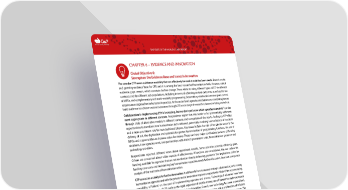 C The Cash Learning Partnership THE STATE OF THE WORLD’S CASH REPORT CHAPTER 6 – EVIDENCE AND INNOVATION Global Objective 6: Strengthen the Evidence Base and Invest In Innovation The case for CTP as an assistance modality that can effectively be used at scale has been made. There is a solid and growing evidence base for CTP, and it is among the best researched humanitarian tools. However, critical evidence gaps remain, which constrain further change. These relate to using different types of CTP in different contexts and for different sub-populations, including in terms of achieving sectoral outcomes, as well as the use of MPGs, and complementary and multi-modality programming. Determining what works best in a given context requires new approaches to be tested in practice. At the sector level, agencies and clusters are considering how to build evidence to achieve sectoral outcomes through CTP, and a range of research is planned or being carried out. 16 Collaboration in implementing CTP is increasing, but we don’t yet know which operational models are the most appropriate in different contexts. Respondents report that this needs to be systematically addressed through trials of alternative models in different contexts and comparison of the results. Scaling up CTP offers opportunities to transform how humanitarian aid is delivered, potentially involving a consolidation of functions and a more prominent role for ‘non-traditional’ players. Key issues include the role of the private sector in the delivery of aid, the digitization and potential for greater harmonization of programming functions, the use of MPGs and opportunities to increase value for money. These can have major ramifications in terms of funding decisions, how agencies work, and partnerships with distinct government units, financial service providers and technology providers. Respondents reported different views about operational models. Some prioritize potential efficiency gains. Others are concerned about wider aspects of effectiveness. If functions are consolidated, this can reduce the funding available for agencies that are not involved in directly delivering payments. The implications of this for funding core costs and maintaining key humanitarian capacities needs further discussion, based on transparent analysis of the real costs of humanitarian action. CTP can act as a catalyst for further innovation. It will benefit from increased strategic collaboration, both among humanitarian agencies and with the private sector. Innovation requires an appetite for risk (and the accompanying possibility of failure) on the part of implementing agencies and donors. Technological advances have been central to the growth of CTP, such as the rapid expansion of mobile money, use of biometrics and more recent attempts to utilize blockchain technology and digital identities. Overall, new technology has been underutilized, with primary reasons being fragmented demand from humanitarian agencies and a proliferation of solutions which address specific issues, rather than taking a more holistic approach to programming requirements. This also relates to the need to enhance data interoperability. 16 ‘The overall structure through which agencies work jointly (either through a partnership, consortium or other form of collaboration) to deliver a CTP. Specifically, in the situation response and analysis, program design and implementation’ (CaLP’s working definition of ‘operational models’). 11