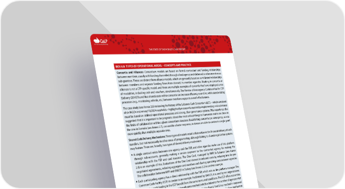 C The Cash Learning Partnership THE STATE OF THE WORLD’S CASH REPORT BOX 6.8 TYPES OF OPERATIONAL MODEL – CONCEPTS AND PRACTICE Consortia and Alliances: Consortium models are based on formal contractual and funding relationships between members, usually with funding channelled through a lead agency and disbersed to other members as sub-grantees. These are distinct from alliance models, which are generally based on semi-formal relationships between members and separate funding flows from donor(s) to member agencies. Working in consortia or alliances is not a CTP-specific model, and there are multiple examples of consortia that have employed a mix of modalities, including cash and vouchers, simultaneously. The Review of Interagency Collaboration for CTP Delivery (2016) found that shared costs within consortia can increase efficiency over time, while standardizing processes (e.g., monitoring, referals, etc.) between members supports overall effectiveness. The case study (see Annex 2.8) reviewing the history of the Lebanon Cash Consortium (LCC) – which consisted of six INGOs and served 18,000 households – highlights that consortia models for implementing cash assistance must be based on defined operational processes and strong, clear governance systems. This experience also suggested that it is important to be pragmatic about the most critical things to harmonize and to be clear on the limits of collaboration within a given consortium structure. Establishing consortia pre-emergency, as was the case in Somalia (see Annex 2.7), can enable a faster response, as donors are able to contract a single grant more quickly than multiple separate ones. Shared Cash Delivery Mechanisms: These types of models entail collaboration in the financial delivery of cash transfers, but not necessarily in other areas of programming, although linking to shared registration systems may feature. There are, broadly, two types of shared delivery mechanism: — A single contract exists between one agency and the FSP, and other agencies make use of this platform through sub-accounts, generally making a service payment to the contracted agency for making the relationship with the FSP and card issuance. The One Card, managed by WFP, in Lebanon (see Annex 2.8) is an example of this. Evaluations of the One Card showed it reduced costs by reducing time for pre- negotiated agreements, reducing aggregate card numbers and sharing operating costs between agencies. The collaboration between WFP and UNICEF in Turkey (see Annex 2.2) is another example. — Each participating agency has a direct relationship with the FSP, which acts as the platform manager. The Common Cash Facility (CCF) in Jordan is an example. Facilitated by UNHCR, it is used by ten organizations. All agencies participating in the CCF benefit from the same terms and conditions. The CCF offers economies of scale and cost advantages: the more beneficaries reached (which is linked to the number of agencies that join), the lower the bank fees . A recent review of the CCF in Jordan found that it has resulted in improved efficiency and accountability of cash assistance activities by CCF members. Bank transfer fees and human resource requirements have reduced. Although it has improved collaboration for cash delivery, including minimizing duplications, it it is not necessarily (nor was it set up to be) a mechanism that contributes to 135 coordination more broadly. Some respondents noted the need to retain the flexibility for contracting multiple service providers in contexts in which variations in quality and access to different service providers depends on the location, and capacity to cover the last mile might be challenging. Currently, the use of a single service provider to deliver assistance may only be appropriate in some contexts, although technological improvements that increase coverage for related infrastructure and penetration of FSPs means that this is likely to change in future (see case studies for DRC and Liberia – Annexes 2.4 and 2.8). Broader Integration of Systems: These types of model are evolving to develop harmonized systems for all CTP project cycle management processes, building on the comparative advantages of stakeholders. The Lebanon One Unified Inter-Organization System for E-Cards (LOUISE) – see Annex 2.8 – is an example. It aims to provide a common platform for payments, linking to joint information management systems, and incorporating common approaches to vulnerability analysis and targeting. There are also efforts to develop a common complaints response mechanism and common monitoring system. This collaboration enables ‘joint programming’ in terms of the operational use of common systems – not joint programming in terms of a single common objective or design. 135 CaLP/UNHCR (2017) Review of the Common Cash Facility Approach in Jordan. 86